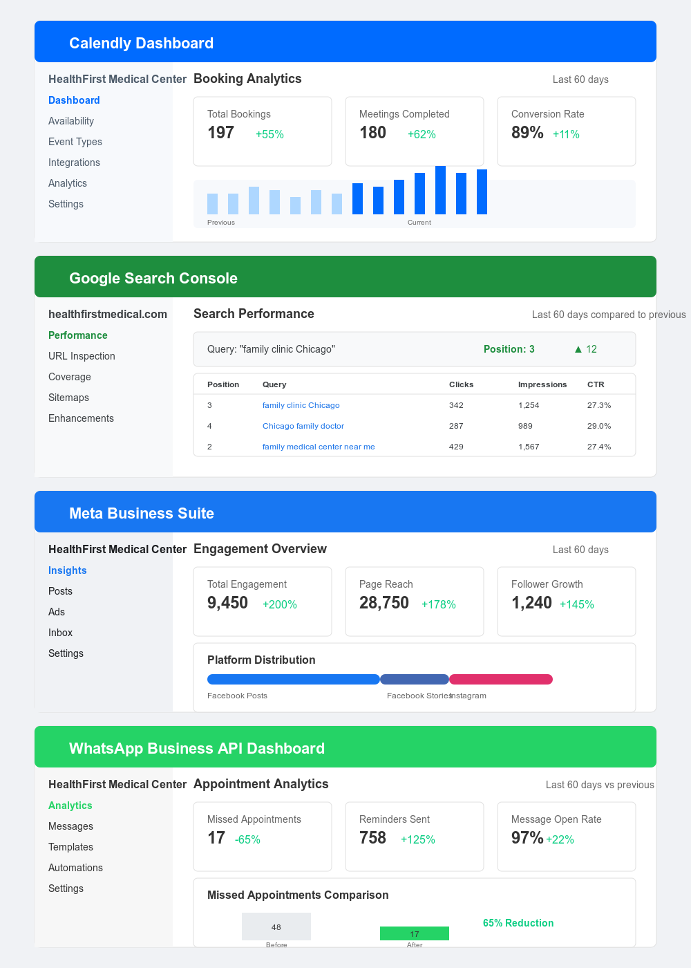 - Share doctor intros, health tips, and promotions on Facebook, Instagram, and LinkedIn.